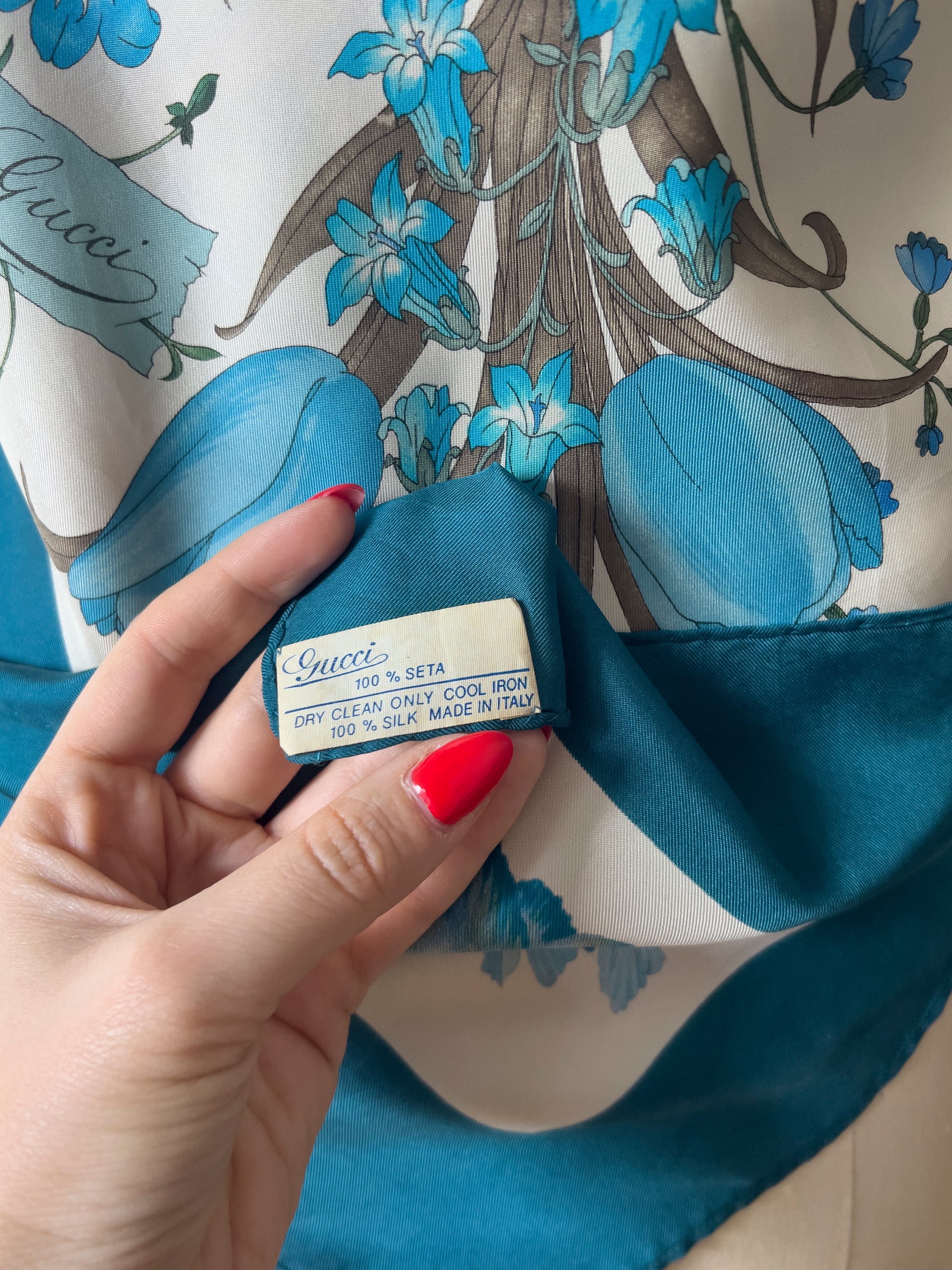 Crafted from a rare, upcycled vintage Gucci silk scarf, this wraparound halter top is a true collector’s piece. The scarf features Gucci’s iconic Flora motif rendered in an exceptionally rare palette of blue hues. Originally illustrated by Italian painter Vittorio Accornero, the artist behind Gucci’s signature Flora design during his tenure with the house from the 1960s to early 1980s, this piece carries a remarkable history of Italian artistry and fashion heritage.