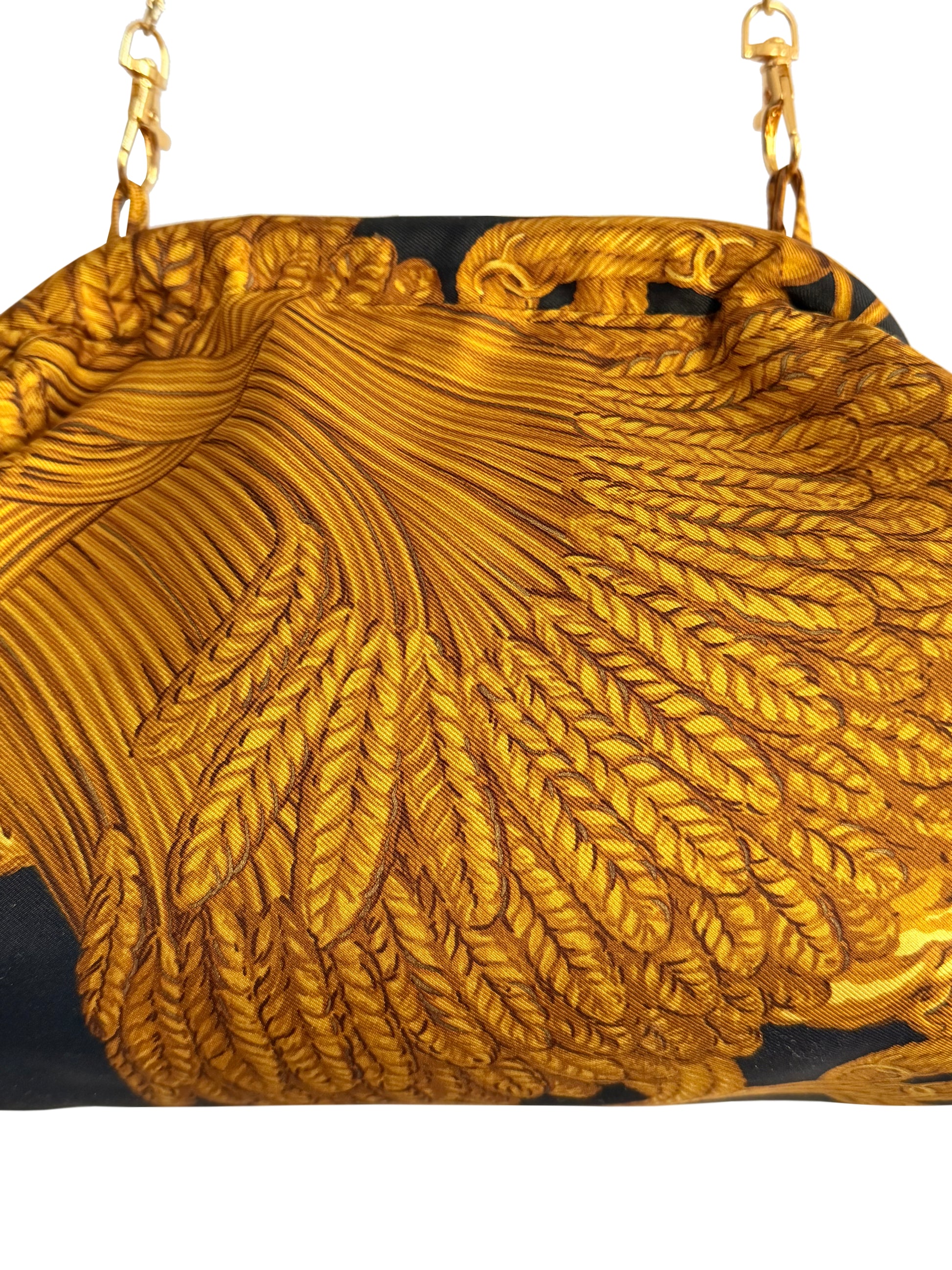 Upcycled from a vintage 1990's Chanel scarf, this purse is a one-of-a-kind heirloom piece. The purse features a vintage-inspired kiss-lock clasp and soft silk twill lining. The costume jewelry handle is detachable, to transform the bag into a pouch—giving you two distinct looks in one.