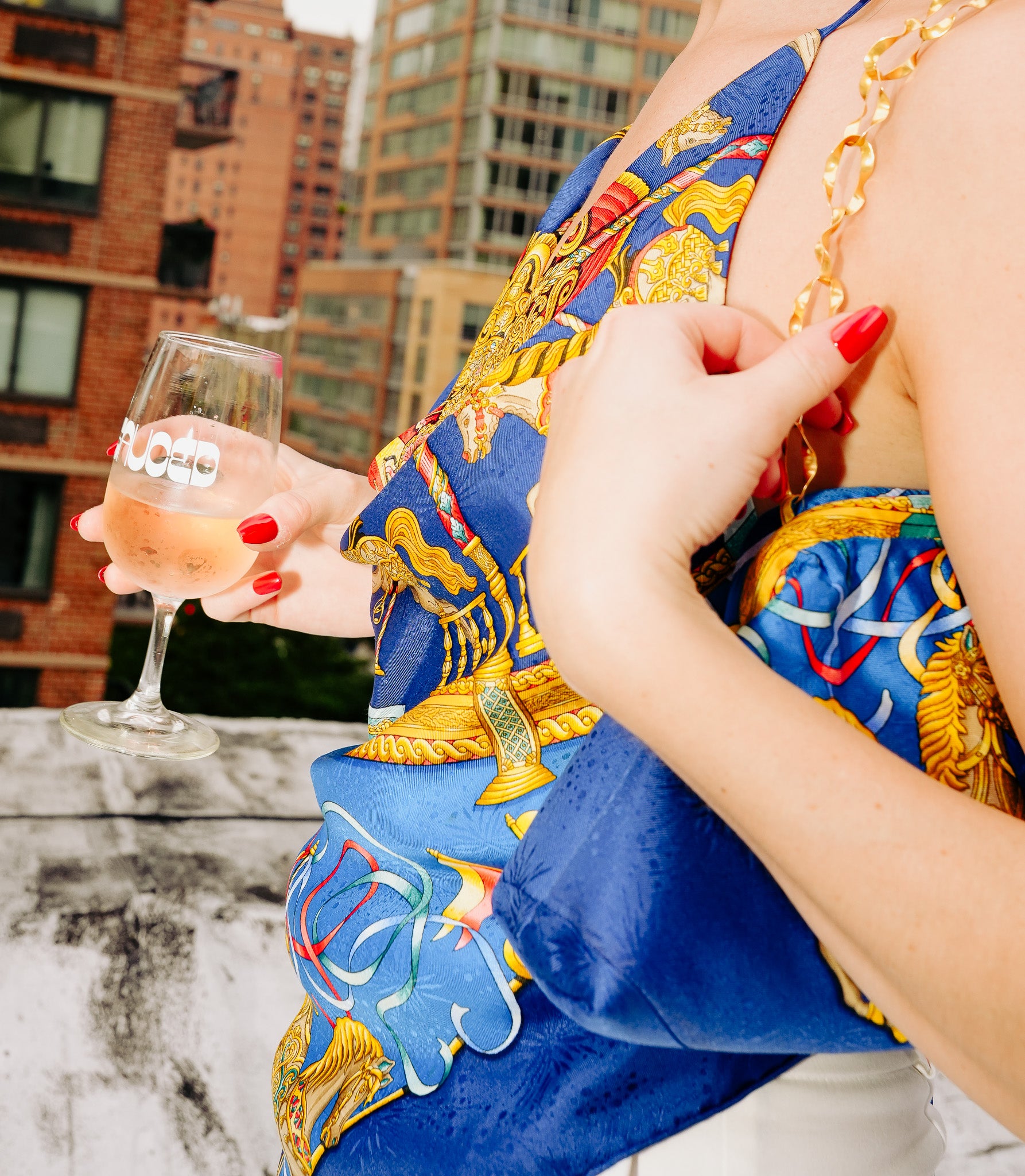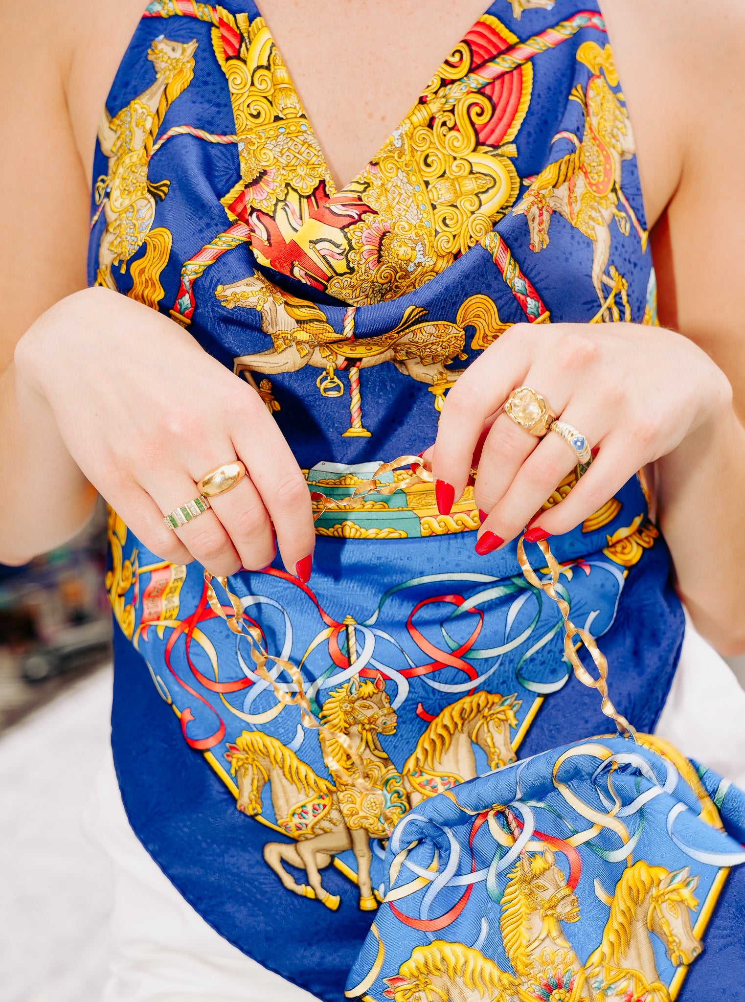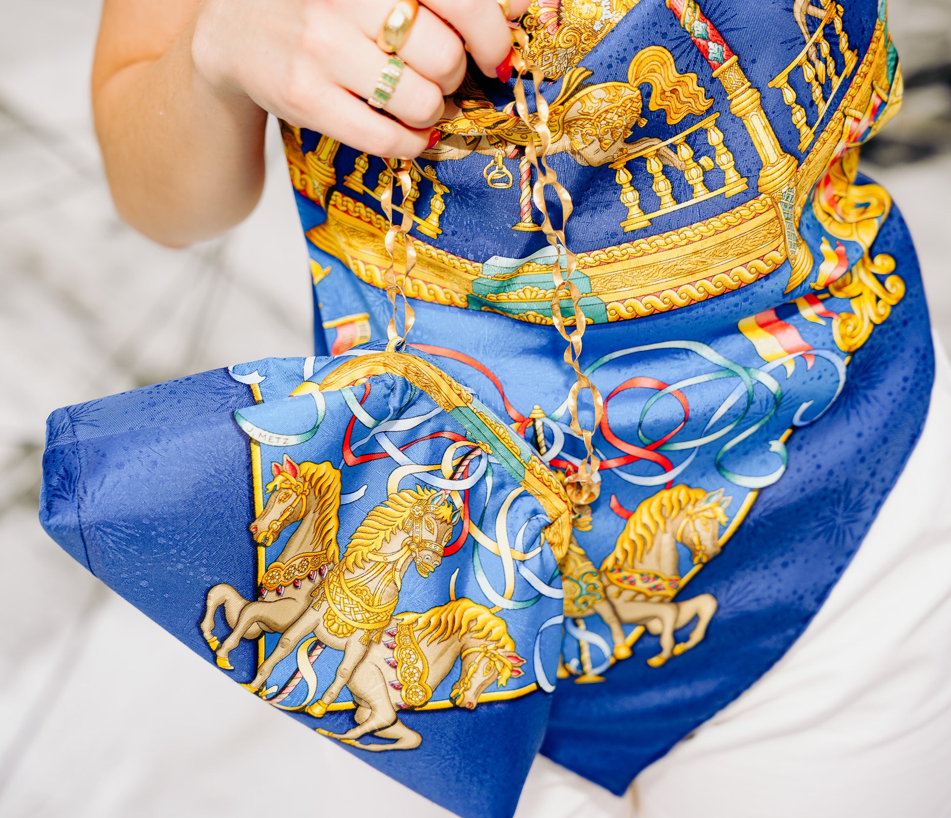 Crafted from a rare, upcycled vintage Hermès Luna Park scarf, this wrap halter top is a one-of-a-kind heirloom piece.