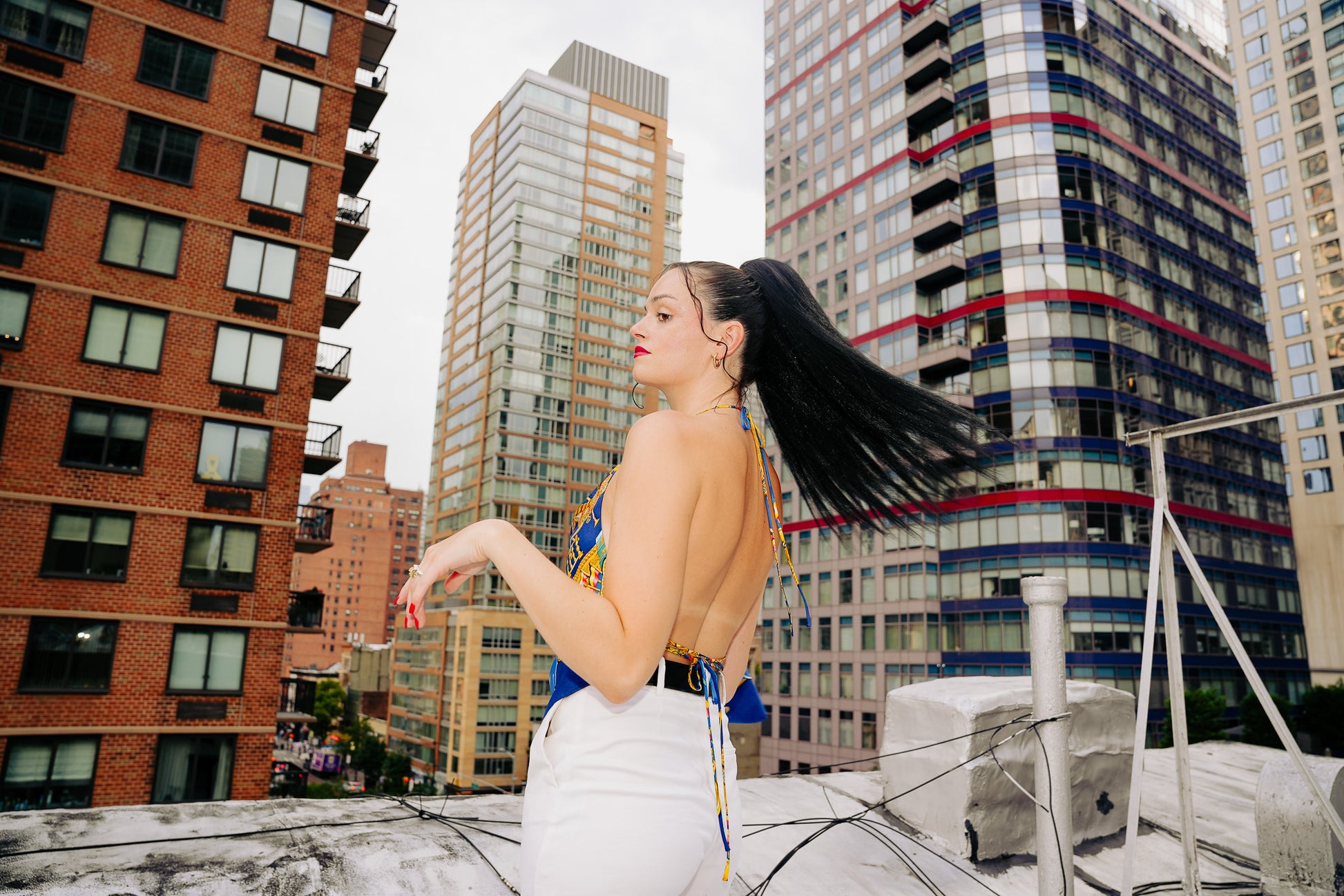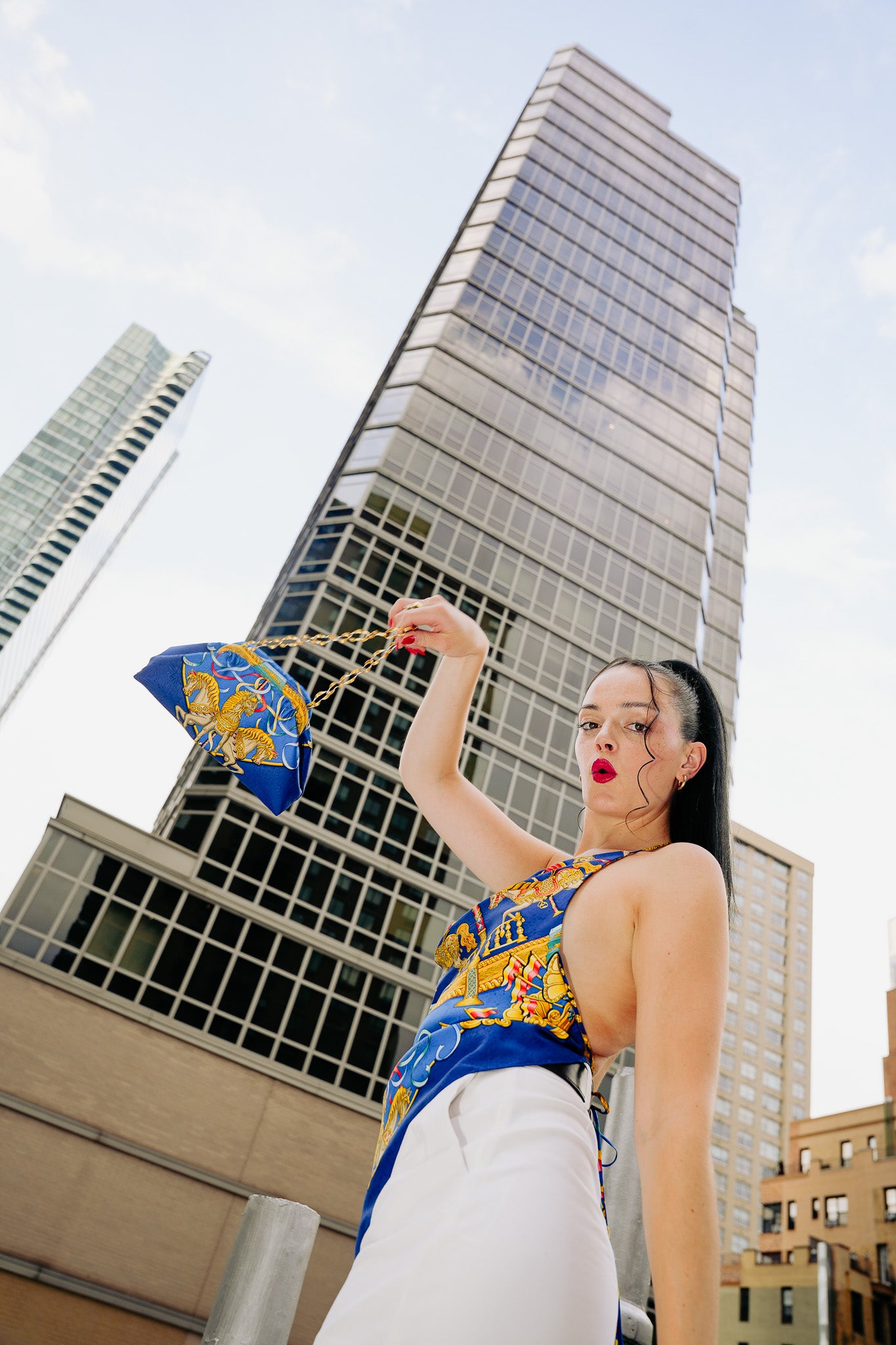 Now transformed into wearable art, this top features a draped cowl neckline and a self-tie, criss-cross back for an adjustable fit. A regal palette of royal blue and gold, brings the ferris wheel motif to life, honoring the rich heritage of the original design while offering a bold new silhouette.