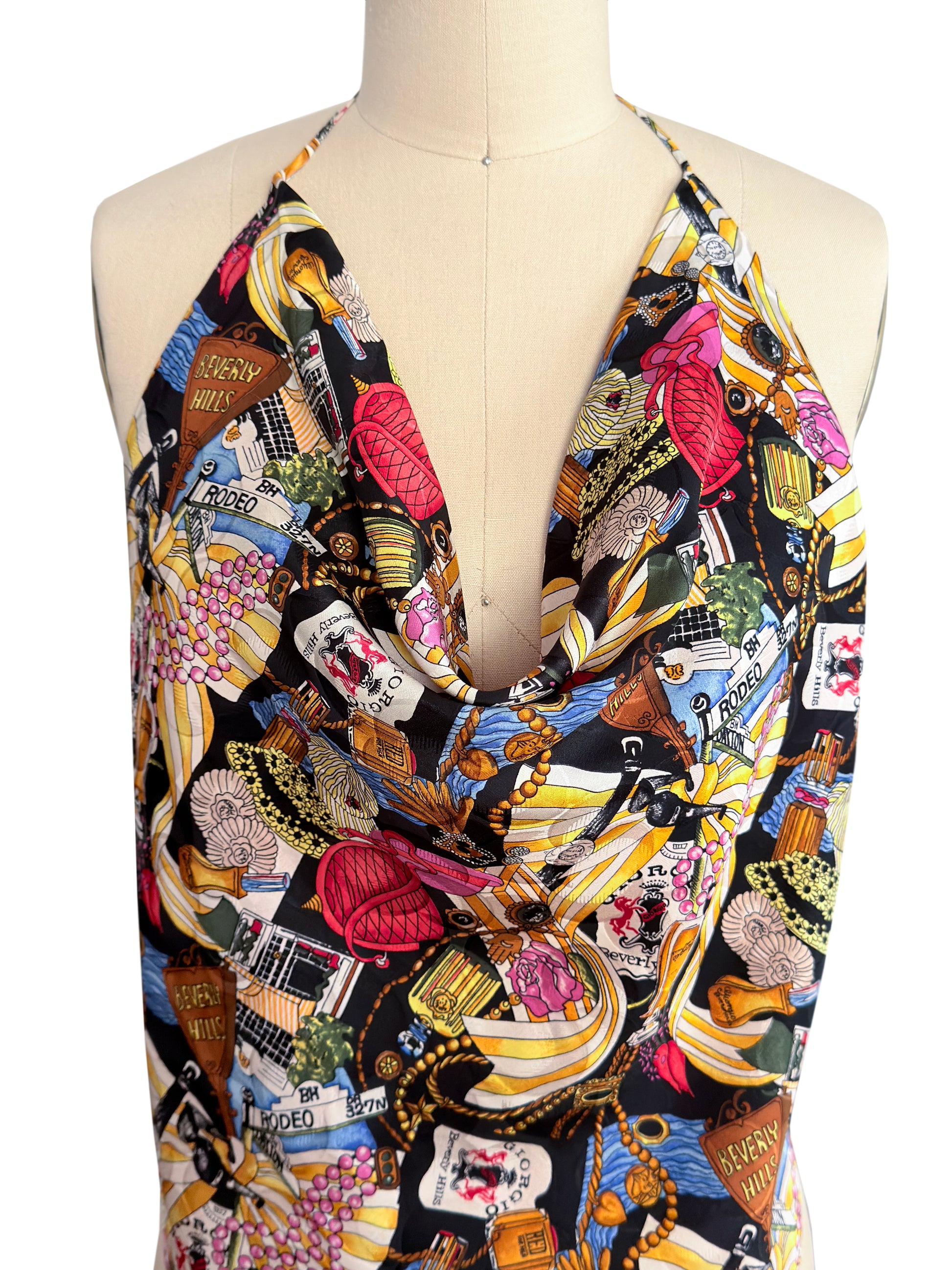 Crafted from a rare, upcycled vintage Nicole Miller silk scarf from 90's, this top is truly one of a kind. The wraparound scarf top features a bold, collage-style Y2K print celebrating the maximalist spirit of turn-of-the-millennium fashion culture. A cowl neckline adds drape and dimension, while the self-tie criss-cross back allows for adjustable support and ease of fit.