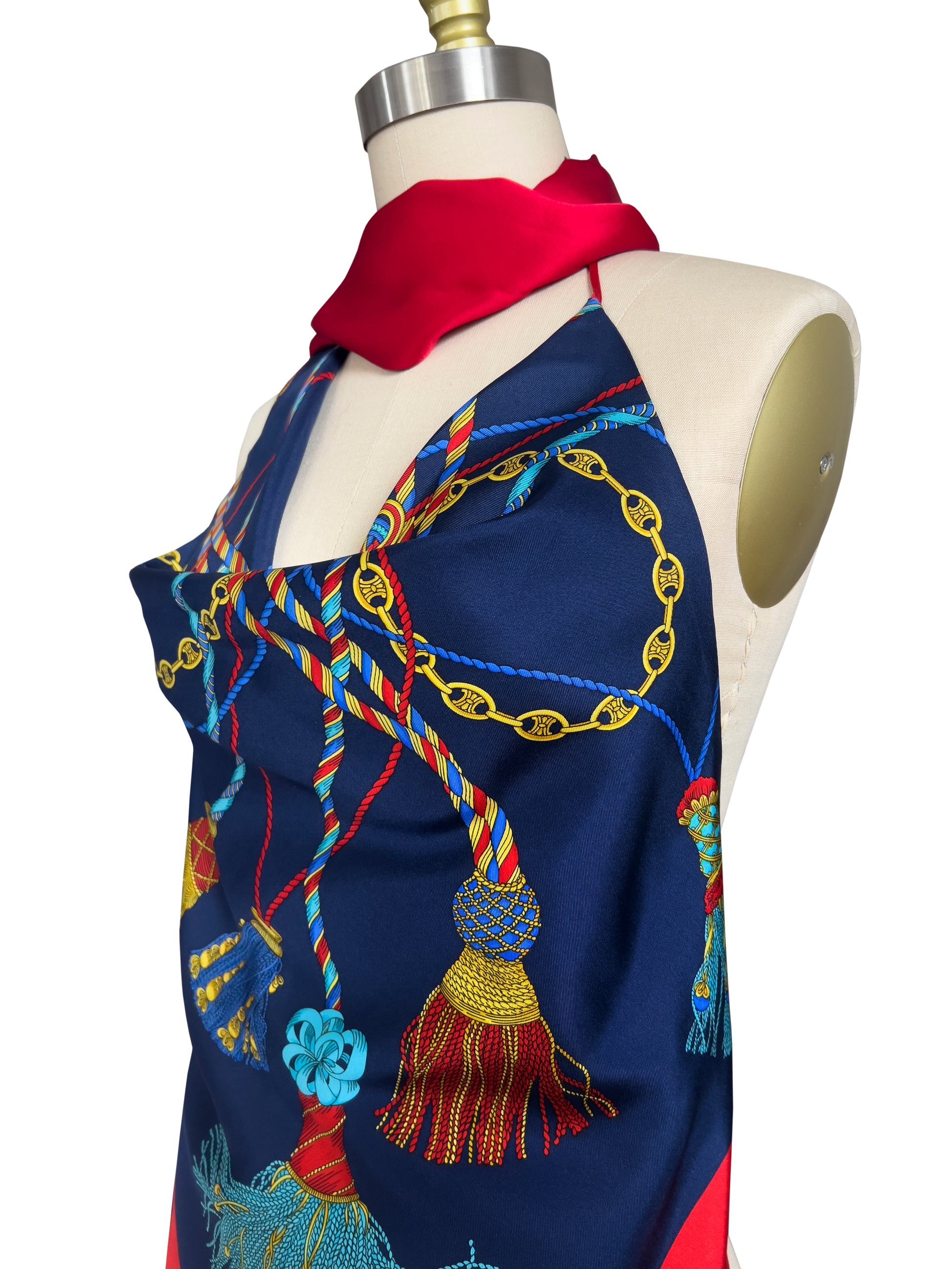 Crafted from a rare, upcycled vintage Celine silk scarf, this wraparound halter top is truly timeless, featuring Celine's classic equestrian style. A cowl neckline adds drape and dimension, while the attached scarf elevates the top into elegant evening wear.